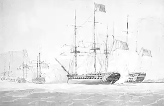 Le , alors que Sybille était ancré au large de Mykonos avec trois navires marchands à destination de Cadix, elle est découverte par un convoi britannique escorté par le HMS Romney, sous le commandement du capitaine Paget et accompagné de trois frégates. Paget s'approche et exige que la Sibylle hisse le drapeau blanc, Rondeau répond qu'il ne pouvait pas arborer un autre drapeau que celui de la République[1].