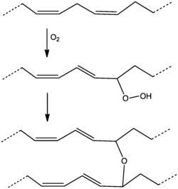 La formation du film par oxydation (« séchage », ou plus exactement durcissement) s'effectue très lentement. Elle peut cependant être accélérée en présence de siccatifs qui sont des composés métalliques plus ou moins solubles (ex. : oxydes de plomb ou de zinc, sels organiques de cobalt, etc.).