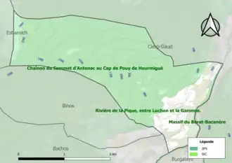 - le « massif de la Barousse et chaînon du sommet d´Antenac au cap de Pouy de Hourmigué » (15 691 ha), couvrant 33 communes dont 18 dans la Haute-Garonne et 15 dans les Hautes-Pyrénées[25].
