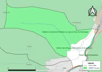 L’inventaire des zones naturelles d'intérêt écologique, faunistique et floristique (ZNIEFF) a pour objectif de réaliser une couverture des zones les plus intéressantes sur le plan écologique, essentiellement dans la perspective d’améliorer la connaissance du patrimoine naturel national et de fournir aux différents décideurs un outil d’aide à la prise en compte de l’environnement dans l’aménagement du territoire. Deux ZNIEFF de type 1[Note 3] sont recensées sur la commune[21] : « chaînon du sommet d'Antenac au cap de Pouy de Hourmigué » (5 751 ha), couvrant 22 communes dont 16 dans la Haute-Garonne et six dans les Hautes-Pyrénées[22] et la « rivière de la Pique, entre Luchon et la Garonne. » (143 ha), couvrant 16 communes du département[23] et deux ZNIEFF de type 2[Note 4],[21] :