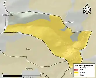 La commune est vulnérable au risque de mouvements de terrains constitué principalement du retrait-gonflement des sols argileux[30]. Cet aléa est susceptible d'engendrer des dommages importants aux bâtiments en cas d’alternance de périodes de sécheresse et de pluie. 82,4 % de la superficie communale est en aléa moyen ou fort (88,8 % au niveau départemental et 48,5 % au niveau national). Sur les 62 bâtiments dénombrés sur la commune en 2019, 62 sont en aléa moyen ou fort, soit 100 %, à comparer aux 98 % au niveau départemental et 54 % au niveau national. Une cartographie de l'exposition du territoire national au retrait gonflement des sols argileux est disponible sur le site du BRGM[31],[Carte 4].