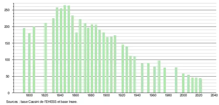 L'évolution du nombre d'habitants est connue à travers les recensements de la population effectués dans la commune depuis 1793. Pour les communes de moins de 10 000 habitants, une enquête de recensement portant sur toute la population est réalisée tous les cinq ans, les populations de référence des années intermédiaires étant quant à elles estimées par interpolation ou extrapolation[35]. Pour la commune, le premier recensement exhaustif entrant dans le cadre du nouveau dispositif a été réalisé en 2006[36].