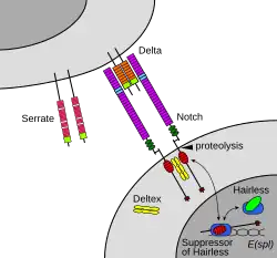 Dans le cas de la voie de signalisation Notch, le mécanisme de transduction du signal peut être relativement simple. L'activation du récepteur Notch peut provoquer son altération par une peptidase : un fragment du récepteur se détache alors de la membrane cellulaire et intervient dans la régulation de l'expression de certains gènes[réf. nécessaire].