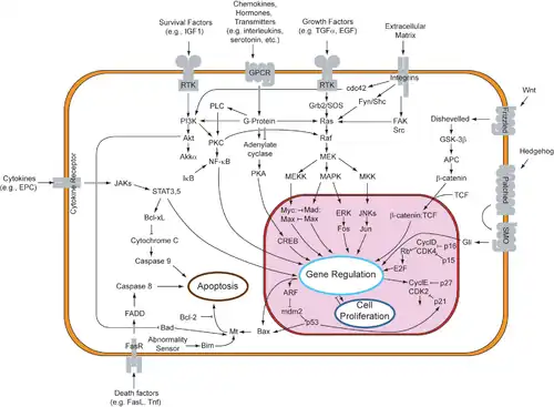 Dans le cas de la voie de signalisation ERK/MAP kinase, c'est l'interaction entre protéines à l'intérieur de la cellule qui est modifiée sous l'effet d'un signal extérieur. De nombreux facteurs de croissance se lient à des récepteurs de la membrane cellulaire et poussent les cellules à progresser le long du cycle cellulaire et à se diviser. Plusieurs de ces récepteurs sont des kinases dont l'activité de phosphorylation dépend de leur liaison à un ligand. Cette phosphorylation peut former un site de liaison pour une autre protéine et ainsi permettre une interaction de protéine à protéine. Dans la voie de signalisation ERK/MAP kinase, un ligand, appelé facteur de croissance épidermique (EGF), se lie au récepteur de l'EGF, ce qui conduit ce dernier à se phosphoryler lui-même et à se lier à la protéine Grb2, une protéine adaptatrice qui couple ce signal à d'autres processus de signalisation en aval. L'une des voies de transduction du signal ainsi activées est la voie de signalisation dite ERK/MAP kinase, ainsi appelée en référence aux protéine kinases activées par mitogène (MAP kinases, autrefois appelées ERK). Ces protéine kinases sont des kinases phosphorylant spécifiquement certaines protéines telles que le facteur de transcription Myc, altérant ainsi la transcription génétique et, en fin de compte, la progression du cycle cellulaire[réf. nécessaire].