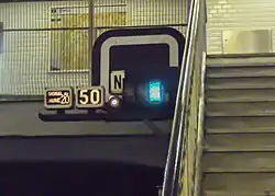 Le signal d'entrée en station comporte trois feux, rouge, vert et blanc. Un feu vert accompagné d'un tableau indicateur de vitesse autorise les trains à pénétrer en station à vitesse réduite dès que le train précédent a dégagé le signal de sortie de la station.