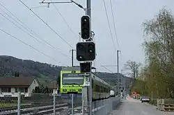 Feu de contrôle pour installation de passage à niveau. Si le passage à niveau est enclenché et les barrières sont baissées, le feu (normalement orange, parfois blanc) clignote. Dans le cas contraire une balise déclenche un freinage d'urgence lors du franchissement du signal. |