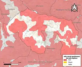 Les mouvements de terrains susceptibles de se produire sur la commune sont des tassements différentiels[37]. Le retrait-gonflement des sols argileux est susceptible d'engendrer des dommages importants aux bâtiments en cas d’alternance de périodes de sécheresse et de pluie[38]. 65,2 % de la superficie communale est en aléa moyen ou fort (58,6 % au niveau départemental et 48,5 % au niveau national métropolitain)[39]. Depuis le , en application de la loi ÉLAN, différentes contraintes s'imposent aux vendeurs, maîtres d'ouvrages ou constructeurs de biens situés dans une zone classée en aléa moyen ou fort[Note 5],[40].