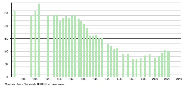 - ↑ Population municipale de référence en vigueur au 1er janvier 2025, millésimée 2022, définie dans les limites territoriales en vigueur au 1er janvier 2024, date de référence statistique : 1er janvier 2022.