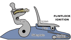 Sur le chien est fixé un morceau de silex (chaque pierre permet une quarantaine de coups). Lors de la pression sur la détente, le silex heurte fortement la lamelle de fer (appelée « batterie ») à la surface rugueuse, ce qui provoque une forte étincelle. En se soulevant, la batterie découvre le bassinet renfermant la poudre d'allumage. Un petit trou reliant le bassinet au canon, appelé la lumière, permet d'enflammer la poudre de tir.