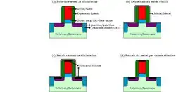 Le procédé est représenté ci-contre: le métal est déposé de manière conformale sur la surface de la plaque CMOS (étape (b)). Durant le recuit suivant (étape (c)), le métal réagit avec le silicium dans les régions où ils sont en contact (jonctions et grille en poly-silicium) pour former le siliciure. En particulier, cette réaction ne se produit pas sur les espaceurs (typiquement en nitrure de silicium), ce qui évite le court-circuit entre les jonctions et la grille. Finalement, le métal non-réagi (c'est-à-dire non transformé en siliciure) est retiré de la surface par une chimie sélective pendant l'étape (d)[1].
