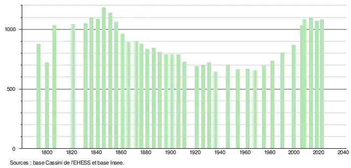 L'évolution du nombre d'habitants est connue à travers les recensements de la population effectués dans la commune depuis 1793. Pour les communes de moins de 10 000 habitants, une enquête de recensement portant sur toute la population est réalisée tous les cinq ans, les populations de référence des années intermédiaires étant quant à elles estimées par interpolation ou extrapolation[20]. Pour la commune, le premier recensement exhaustif entrant dans le cadre du nouveau dispositif a été réalisé en 2008[21].