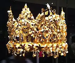 Couronne royale de Silla, seconde moitié du Ve siècle. Or et jade, tumulus de Seobongchong fouillé en 1926. Musée national de Corée, Séoul[16].