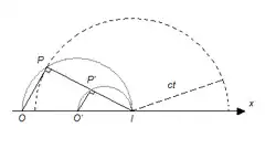 Tout en laissant fixe, faisons varier , ce qui revient à faire varier c=g/, et donc le rayon ct du cercle en pointillés longs. On voit ainsi que, pour chaque point P du demi-cercle de diamètre OI, on peut trouver une valeur de telle que P soit à l'intersection du demi-cercle de rayon ct et du demi-cercle de diamètre OI. Donc, au temps , il passe une onde stationnaire par rapport au bateau en chaque point du demi-cercle de diamètre OI.