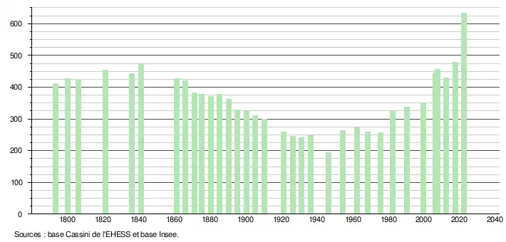 L'évolution du nombre d'habitants est connue à travers les recensements de la population effectués dans la commune depuis 1793. Pour les communes de moins de 10 000 habitants, une enquête de recensement portant sur toute la population est réalisée tous les cinq ans, les populations de référence des années intermédiaires étant quant à elles estimées par interpolation ou extrapolation[15]. Pour la commune, le premier recensement exhaustif entrant dans le cadre du nouveau dispositif a été réalisé en 2007[16].