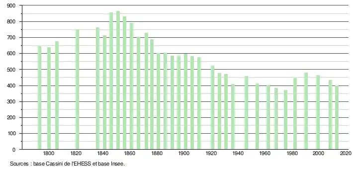 L'évolution du nombre d'habitants est connue à travers les recensements de la population effectués dans la commune depuis 1793. À partir du , les populations légales des communes sont publiées annuellement dans le cadre d'un recensement qui repose désormais sur une collecte d'information annuelle, concernant successivement tous les territoires communaux au cours d'une période de cinq ans. Pour les communes de moins de 10 000 habitants, une enquête de recensement portant sur toute la population est réalisée tous les cinq ans, les populations légales des années intermédiaires étant quant à elles estimées par interpolation ou extrapolation[26]. Pour la commune, le premier recensement exhaustif entrant dans le cadre du nouveau dispositif a été réalisé en 2008[27],[Note 2].