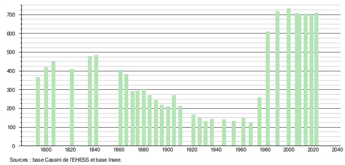 L'évolution du nombre d'habitants est connue à travers les recensements de la population effectués dans la commune depuis 1793. Pour les communes de moins de 10 000 habitants, une enquête de recensement portant sur toute la population est réalisée tous les cinq ans, les populations de référence des années intermédiaires étant quant à elles estimées par interpolation ou extrapolation[17]. Pour la commune, le premier recensement exhaustif entrant dans le cadre du nouveau dispositif a été réalisé en 2008[18].