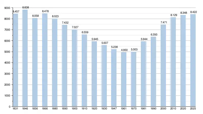 Les chiffres des années 1831 à 1970 tiennent compte des chiffres des anciennes communes fusionnées.