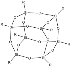 Les silsesquioxanes possèdent la formule chimique empirique RSiO3/2 où Si est l'élément silicium, O est l'oxygène et R est soit l'hydrogène soit un groupe alcane, alcène, aryle ou arylène[1]. Ces matériaux sont utilisés comme supports pour les catalyseurs[2] et plus récemment sur les matériaux sensibles au pH[3]. Les silsesquioxanes peuvent avoir une structure semblable à une cage, comme sur l'image ci-contre, le plus souvent un cube, un prisme hexagonal ou un prisme octogonal[4],[5],[6] ou encore un prisme décagonal[7] ou dodécagonal[8].