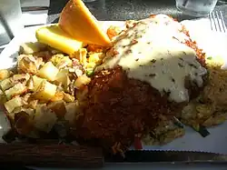 Filet frit de poisson-chat servi avec des patates et une omelette.