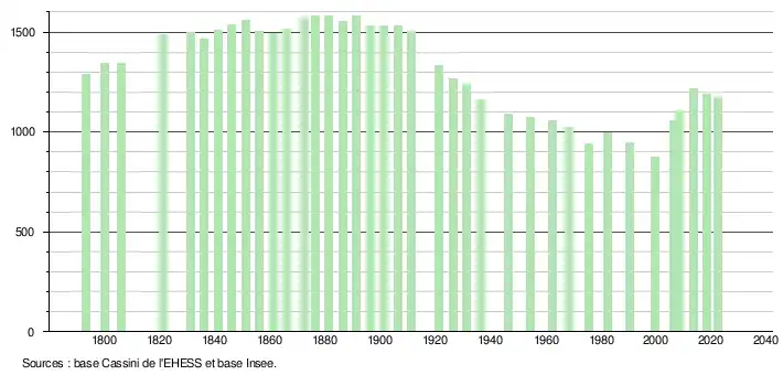 L'évolution du nombre d'habitants est connue à travers les recensements de la population effectués dans la commune depuis 1793. Pour les communes de moins de 10 000 habitants, une enquête de recensement portant sur toute la population est réalisée tous les cinq ans, les populations de référence des années intermédiaires étant quant à elles estimées par interpolation ou extrapolation[15]. Pour la commune, le premier recensement exhaustif entrant dans le cadre du nouveau dispositif a été réalisé en 2008[16].