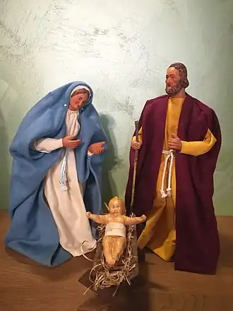 - ↑ Les vêtements exécutés en tissus provençaux d’origine, parfois en tissus anciens, indiennes, châles, etc. et contribuent au charme des santons. voir http://www.santons-simonejouglas.com/Catalogue-Tarif-2014-01.pdf
