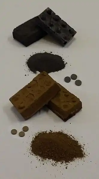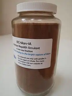 Les instruments embarqués par les sondes Viking et par Mars Pathfinder ont permis de déterminer les propriétés du régolithe martien sur leur site d'atterrissage. Ces résultats ont conduit en 1997 au développement du simulant JSC Mars-1 au Johnson Space Center de la NASA[2]. Il contient du téphra palagonitique dont les particules ont une taille inférieure à 1 millimètre. Ce matériau, qui consiste en de la cendre volcanique vitreuse altérée à basse température, provient du cône volcanique de Pu'u Nene, situé entre le Mauna Loa et le Mauna Kea à Hawaï, dont le téphra présente une forte analogie avec les régions brillantes de Mars[3].