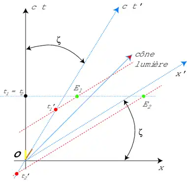 Les deux événements et sont simultanés dans le repère (Ox,ct). Les axes de temps égaux dans chacun des repères sont les lignes parallèles aux axes Ox et O'x', respectivement. Manifestement dans le cas du schéma, l'événement a lieu avant , vus du repère (O'x',ct').