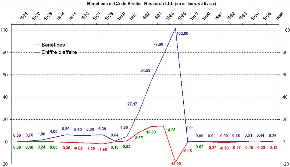Créée en 1961, la société Sinclair Radionics commence par réaliser des bénéfices grâce à ses produits hi-fi comme l'ensemble audio Project 60, et à ses calculatrices, mais l'échec coûteux de la montre Black Watch et la concurrence de l'électronique japonaise[12], au milieu des années 1970, inversent la tendance, permettant à la National Enterprise Board de prendre le contrôle de l'entreprise. Le succès de Sinclair viendra au début des années 1980, avec sa deuxième société Sinclair Research (anciennement Ablesdeal), grâce à la sortie du ZX80. Au faîte de sa réussite, Sinclair compte 140 salariés[38], mais les investissements nécessaires aux trois projets de l'ordinateur QL, de la voiture C5 et de la télévision portable TV80 en 1985 ne sont pas compensés par les ventes, et c'est pour Sinclair le début de la chute : en 1990, il ne reste plus que trois salariés dans l'entreprise.