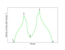 La fonction g(E) tend à avoir des singularités à racine carrée (voir la figure) pour une surface de Fermi sphérique à gaz d'électrons libres :