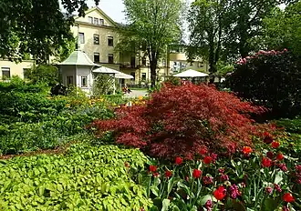 Le parc est divisé en différents milieux végétaux séparés par des allées. On y rencontre une petite prairie fleurie, des zones de pelouses, des carrés plantes médicinales et des parterres de fleurs avec du houblon, des roses, des vignes sauvages, des tulipes et des clématites. Les vieux marronniers d'Inde fournissent de l'ombre et les sentiers recouverts d'écorce contribuent à l'atmosphère forestière. Le jardin comprend auss divers arbres fruitiers. Un bassin miroir avec de l'eau ondulante, des nénuphars et des poissons rouges est destiné à stimuler les sens et un banc rouge vif invite à un « temps de réflexion ».