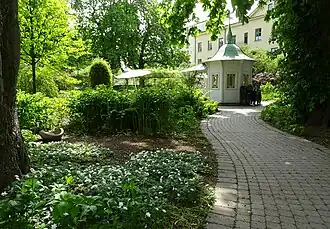 Au centre du parc, on peut voir un petit belvédère de 1784, qui se trouvait à l'origine dans le parc Klarahuset près de l'horloge à gaz Klaragasverket. L'horloge à gaz a été démolie en 1970, le kiosque a été entretenu et reconstruit à Sinnenas trädgården en 1996. Le Musée de la ville de Stockholm a estimé que la petite maison avait « des valeurs culturelles et historiques particulièrement élevées » et lui a décerné un label bleu[3]. Aux entrées se trouvent des pergolas où grimpent des houblons et des rosiers parfumés, ainsi que des vignes sauvages et des clématites[2].