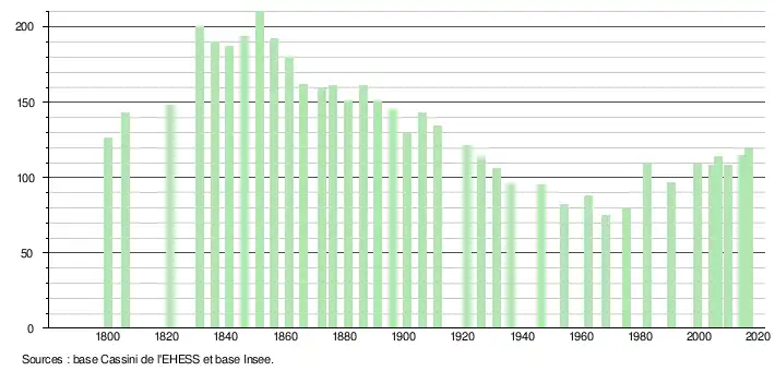 L'évolution du nombre d'habitants est connue à travers les recensements de la population effectués dans la commune depuis 1800. Pour les communes de moins de 10 000 habitants, une enquête de recensement portant sur toute la population est réalisée tous les cinq ans, les populations de référence des années intermédiaires étant quant à elles estimées par interpolation ou extrapolation[6]. Pour la commune, le premier recensement exhaustif entrant dans le cadre du nouveau dispositif a été réalisé en 2004[7].