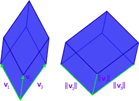 Interprétations de Ω et Π dans le cas 3D: à gauche, un parallélépipède (de volume Ω) ; à droite, le parallélépipède rectangle correspondant (de volume Π).