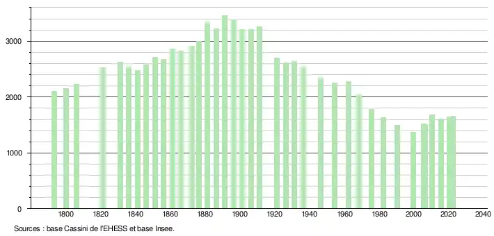 L'évolution du nombre d'habitants est connue à travers les recensements de la population effectués dans la commune depuis 1793. Pour les communes de moins de 10 000 habitants, une enquête de recensement portant sur toute la population est réalisée tous les cinq ans, les populations de référence des années intermédiaires étant quant à elles estimées par interpolation ou extrapolation[12]. Pour la commune, le premier recensement exhaustif entrant dans le cadre du nouveau dispositif a été réalisé en 2005[13].