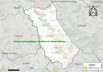 Une ZNIEFF de type 2[Note 1] est recensée sur la commune[14] : le « réseau hydrographique du Midou et milieux annexes » (6 344 ha), couvrant 43 communes dont 37 dans le Gers et six dans les Landes[15].