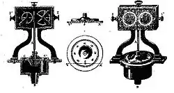 À un cylindre métallique est suspendu un cadre avec deux cadrans à aiguilles qui servent de compte-tours. L’axe de ce cylindre (A) est une vis sans fin qui fait tourner les aiguilles au moyen de roues dentées, solidaire d’un disque.