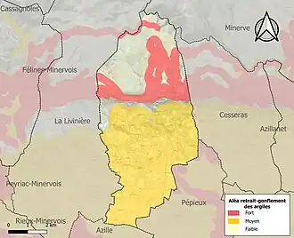 Le retrait-gonflement des sols argileux est susceptible d'engendrer des dommages importants aux bâtiments en cas d’alternance de périodes de sécheresse et de pluie. 75 % de la superficie communale est en aléa moyen ou fort (59,3 % au niveau départemental et 48,5 % au niveau national). Sur les 533 bâtiments dénombrés sur la commune en 2019, 532 sont en aléa moyen ou fort, soit 100 %, à comparer aux 85 % au niveau départemental et 54 % au niveau national. Une cartographie de l'exposition du territoire national au retrait gonflement des sols argileux est disponible sur le site du BRGM[25],[Carte 2].