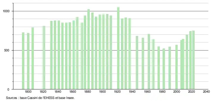 L'évolution du nombre d'habitants est connue à travers les recensements de la population effectués dans la commune depuis 1793. Pour les communes de moins de 10 000 habitants, une enquête de recensement portant sur toute la population est réalisée tous les cinq ans, les populations de référence des années intermédiaires étant quant à elles estimées par interpolation ou extrapolation[31]. Pour la commune, le premier recensement exhaustif entrant dans le cadre du nouveau dispositif a été réalisé en 2008[32].