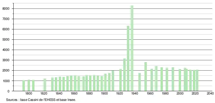 L'évolution du nombre d'habitants est connue à travers les recensements de la population effectués dans la commune depuis 1793. Pour les communes de moins de 10 000 habitants, une enquête de recensement portant sur toute la population est réalisée tous les cinq ans, les populations de référence des années intermédiaires étant quant à elles estimées par interpolation ou extrapolation[32]. Pour la commune, le premier recensement exhaustif entrant dans le cadre du nouveau dispositif a été réalisé en 2008[33].