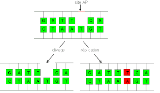 Les sites AP ont par ailleurs un très fort effet mutagène : au moment de la réplication, les ADN polymérases n'ont aucun moyen de déterminer quelle base placer en face de ces sites vacants, et vont "choisir" une base arbitrairement. Le plus souvent, les polymérases vont insérer préférentiellement une adénine (la "règle du A"), de sorte que le site abasique sera remplacé par une thymine[7],[8].