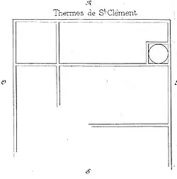 Le complexe thermal, sur le plateau Saint-Clément, se trouve dans la partie sud-ouest du site antique. Il est partiellement fouillé en 1886 mais Léon Maître n'est alors pas certain qu'il s'agisse de thermes[10] ; son existence est toutefois confirmée en 1966 sans que son architecture et la distribution des salles puisse être précisée ni que les dernières trouvailles puissent être intégrées au plan partiel de 1886[11].