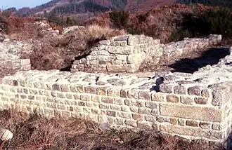 - Les structures du second monument, situé à 30 m au nord du précédent, sont mieux conservées. De plan carré, les dimensions extérieures sont de 12,75 m pour la galerie et 6,80 m pour la cella. La face externe des murs de la galerie, épais de 0,65 m, est construite en petit appareil régulier. La face interne est bâtie en opus incertum, comme le mur de la cella épais de 0,70 m. Tous les angles sont appareillés en gros blocs de gneiss parfaitement taillés. Un dallage précédait l'entrée orientée à l'est. Le mobilier recueilli lors de la fouille de ce bâtiment comprend un antéfixe, des débris d'enduits peints, des plaques et une base de colonne en calcaire, quelques tesselles de mosaïque en pâte de verre, un sesterce d'Antonin le Pieux, un tesson de verre à décor gravé et de la céramique. Le site a livré quelques objets (des fragments d'antéfixes, de la céramique sigillée et commune) et deux monnaies (une de Nîmes et un bronze de Marc Aurèle[5]).