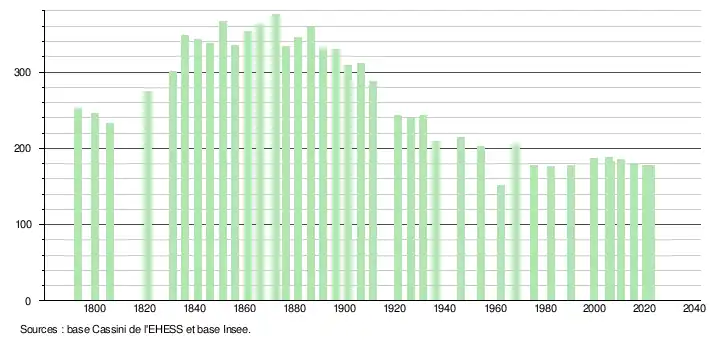 L'évolution du nombre d'habitants est connue à travers les recensements de la population effectués dans la commune depuis 1793. Pour les communes de moins de 10 000 habitants, une enquête de recensement portant sur toute la population est réalisée tous les cinq ans, les populations de référence des années intermédiaires étant quant à elles estimées par interpolation ou extrapolation[34]. Pour la commune, le premier recensement exhaustif entrant dans le cadre du nouveau dispositif a été réalisé en 2005[35].