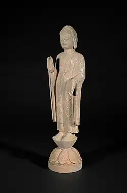 Le bouddhisme est originaire d'Inde, où il apparaît autour de 500/400 av. J.-C., et pénètre en Chine du Nord au Ier siècle via les routes provenant d'Asie centrale, sous la forme du « Grand Véhicule » (sanskrit Mahayana)[64],[65]. Les premières traductions en chinois de textes bouddhistes en sanskrit s'accomplissent à Luoyang sous les Han postérieurs, avant de se développer également dans le Sud, des traductions étant effectuées à Jiankang à partir du IIIe siècle, sous le royaume de Wu et la dynastie des Jin orientaux. Progressivement les moins chinois élaborent leurs premiers textes originaux, y compris des traités apocryphes présentés comme originaires d'Inde, qui avaient souvent pour finalité d'adapter les croyances bouddhistes à la pensée chinoise[66]. Durant le haut Moyen-Âge, le bouddhisme qui se développe au Nord est plus dévotionnel et moraliste, tandis qu'au Sud il prend racine dans le milieu des élites lettrées pratiquant les « causeries pures » séduits par l'idée de vacuité présente dans les écrits du bouddhisme[67].
