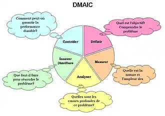 La méthode se base ainsi sur cinq étapes qui se contractent dans l’acronyme « DMAIC » en anglais : Define, Measure, Analyse, Improve, Control, soit « Définir, mesurer, analyser, améliorer, maîtriser »[2].