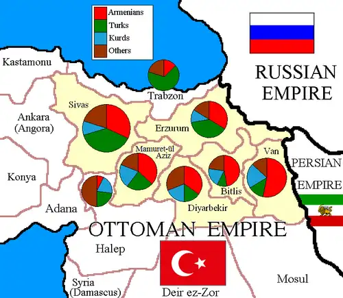 En 1864, l'Empire ottoman entreprend de vastes réformes administratives territoriales inspirées du modèle centralisé napoléonien, remplaçant les provinces de l'Empire par vingt-sept vilayets, prenant le nom de leur chef-lieu. Au terme de plusieurs réaménagements (en 1878, 1880 et 1895) l'Anatolie orientale se voit finalement découpée en six vilayets, visant ainsi à diluer la population arménienne dans d'autres peuples afin qu'elle ne constitue plus une majorité compacte dans une circonscription, pouvant justifier un statut de plus grande autonomie[14]. Le terme « Six provinces arméniennes » a d'abord été utilisé au congrès de Berlin en 1878, où l'Empire ottoman devait s'engager à y faire des réformes.