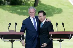 Le successeur de Roh, Lee Myung-bak, devient président en février 2008[41]. Indiquant le « pragmatisme créatif » comme principe directeur, l'administration de Lee a entrepris de revitaliser une économie en déclin, de redynamiser les relations diplomatiques, de stabiliser la protection sociale et de relever les défis de la mondialisation[42],. En avril 2008, le parti au pouvoir obtient la majorité aux élections législatives[43]. Le même mois, des pourparlers avec les États-Unis ont permis d'aborder la question de l'accord de libre-échange entre les deux pays, ce qui a contribué à apaiser les tensions entre les deux pays provoquées par les administrations précédentes. Lee a accepté de lever l'interdiction sur les importations de bœuf américain, ce qui a provoqué des manifestations massives dans les mois qui ont suivi, alors que la paranoïa face à une éventuelle maladie de la vache folle se diffusait largement dans le pays[44].