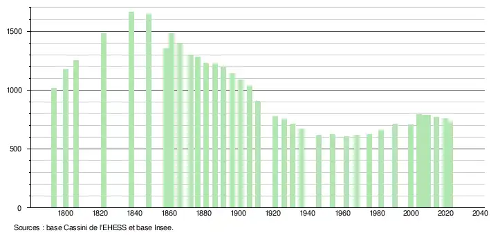 L'évolution du nombre d'habitants est connue à travers les recensements de la population effectués dans la commune depuis 1793. Pour les communes de moins de 10 000 habitants, une enquête de recensement portant sur toute la population est réalisée tous les cinq ans, les populations de référence des années intermédiaires étant quant à elles estimées par interpolation ou extrapolation[19]. Pour la commune, le premier recensement exhaustif entrant dans le cadre du nouveau dispositif a été réalisé en 2004[20].