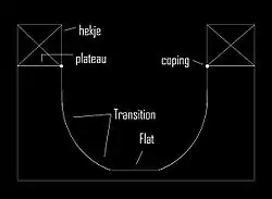 • Le half-pipe ou rampe : il s'agit d'une rampe en forme de U, dans laquelle les skateurs effectuent des va-et-vient, prenant de la vitesse et effectuant de part et d'autre des tricks divers. À l'extrémité du half-pipe se trouve un rail de forme tubulaire appelé « coping », et sur lequel peuvent se faire des slides ou des grinds aussi bien que des tricks plus particuliers (tricks au coping). Le nom « half-pipe » signifie en anglais « demi-tube », une dénomination qui parait évidente lorsque l'on considère la forme du module.