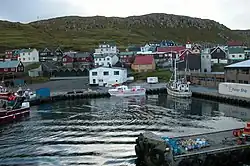 Localisation de la commune (en vert) avec celle de ville de Skopun (en rouge) | |||